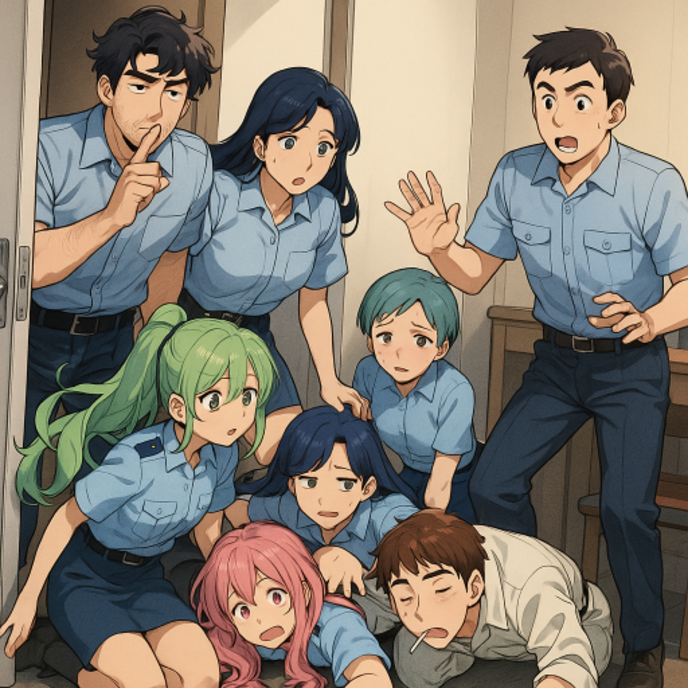 隊長室のドアのすぐ向こう側、廊下の白い長尺シートの上に、見事な「人間の束」が出来上がっていた。かなめが一番上、その下でカウラの眼鏡がずれ、アメリアの長い脚が島田の脇腹に突き刺さっている。パーラとサラは気まずそうに顔だけこちらを向け、島田は『あだだだ』と情けない声を出した。