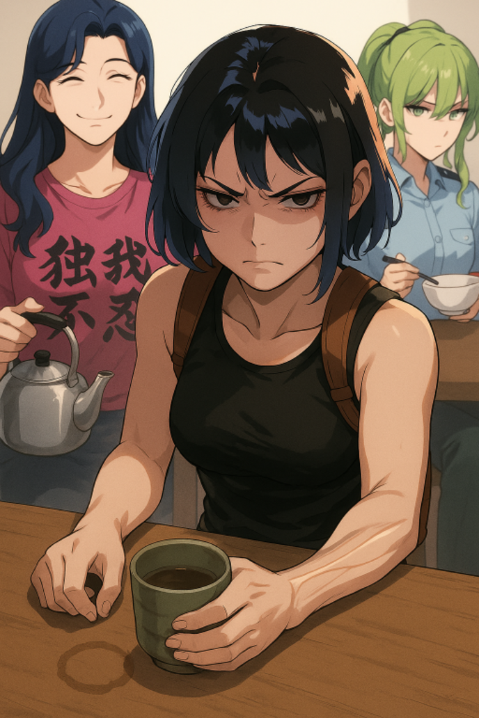 タレ目で迫力が減少しているとは言え、明らかに殺意を込めた視線をアメリアに送りながらかなめは誠を引かせるだけの迫力があった。かなめはそのままの表情でゆっくりと番茶をすすっていた。