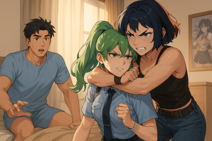 目を覚ますと、目の前でかなめがカウラの首をチョークスリーパーで締め上げていた。透き通るようなエメラルドグリーンの髪が、その動きにあわせて揺れている。