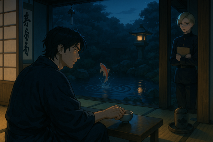 一瞬、風の温度が変わった。都市近郊に設置された気温制御システムが夜のそれへと変わったのだろう。開いたふすまの向こうに広がる池で三尺を超える大きな金色の錦鯉が跳ねた。