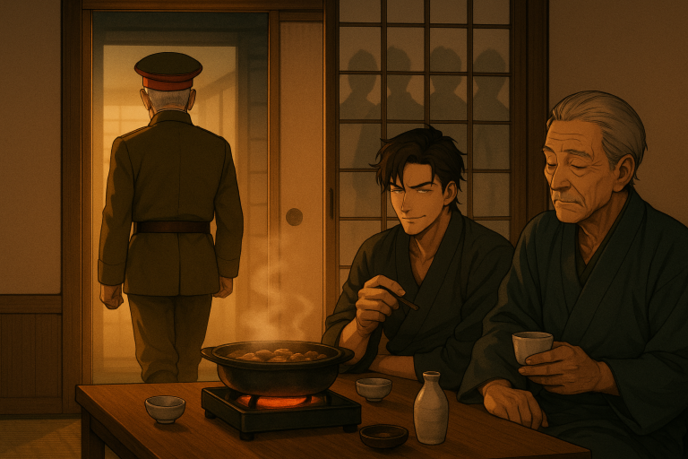 嵯峨の表情は事の成り行きを楽しんでいるように見えた。醍醐が出て行ったこの奥座敷のふすまの向こうからは心配そうな表情ですべてを見守る食客達の姿が嵯峨からも見ることが出来た。