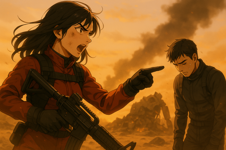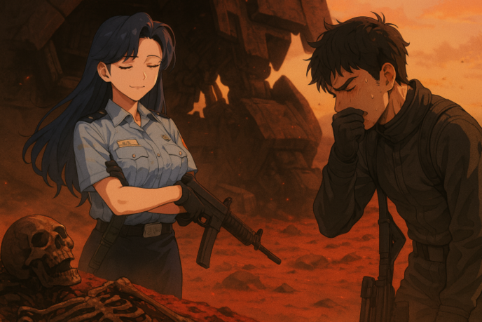 そんな背後の平和な雰囲気と目の前の戦場を感じさせる惨状を目の前にして誠が全身を強張らせたその時だった。誠は、何かの影が動いたように見えて……。反射的にトリガーを引いていた。