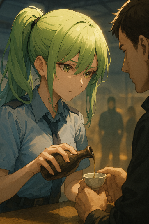 真剣な緑の瞳。ポニーテールのエメラルドグリーンの髪を震わせカウラは不器用に焼酎を注ぐ。