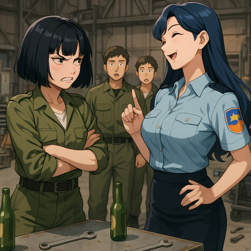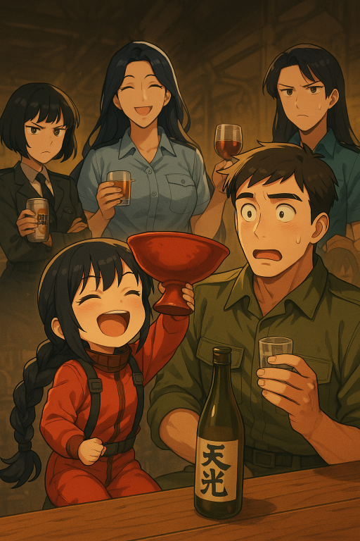 「生意気な口を叩くじゃねーか!一人前にポン酒を飲みてーだ?これはまだオメーには早ーんだ。もっと強くなれ!そーしたらこのうまい本当の日本酒を飲ませてやる。この焼酎もいつも隊長が飲んでる甲種焼酎なんかじゃねー。本格焼酎の高級品だ。アタシも飲んだが、焼酎とは思えねー仕上がりだ。安心して飲め」