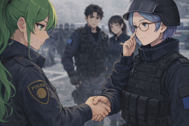 指揮官は一瞬戸惑ったような表情を浮かべると握手の為に手を伸ばした。カウラにはエルマの手の温度が『覚醒施設』を思い出させる。カウラはその記憶を押し込めた。だがエルマも同じことを考えていたようで喜色の奥に、どこかぎこちなさ。エルマの髪はライトブルー……カウラと同じ戦闘用人造人間『ラスト・バタリオン』の証だ。