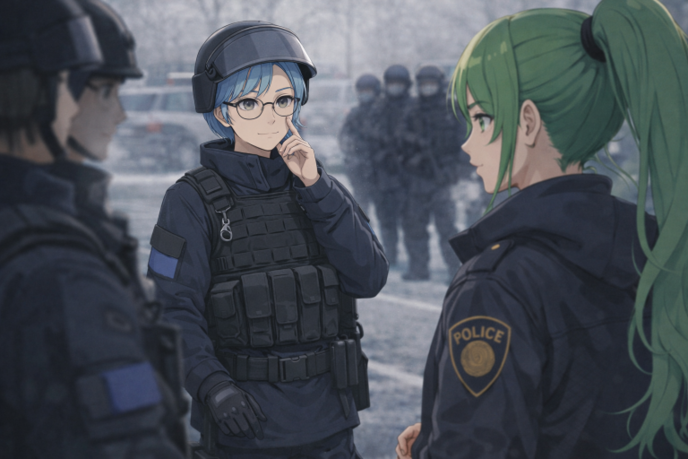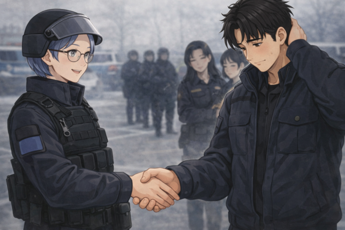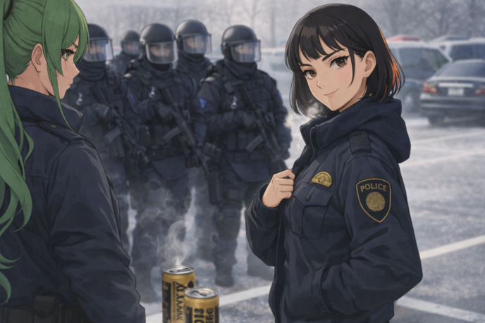 冬の弱い日差し。吐く息は白く、駐車場にはマックスコーヒーの甘い匂いがあたりに漂う。次枠を待つ東都警察の機動隊重武装下警官たちがまるで訓練を終えて一息をついている誠達を羨むように静かに整列していた。