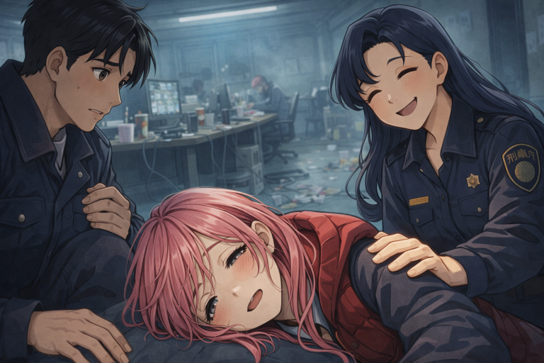 入口を開けると、人いきれとカップ麺とポテトチップスの混じった匂い。本来は休憩室のスペースにテーブルが並び、配線と端末、ペンタブ、紙コップが散らばっている。モニターのファンが低く唸り、室内の空気はべたついていた。
