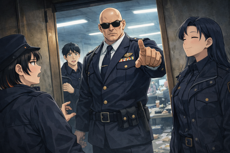 開いたドアの向こうから現れたのはツルツルに反り上げられた坊主頭の長身の誠やアメリアさえも凌駕する2メートルを超える巨漢の持主だった。そしてそのトレードマークと化しているサングラスの下で笑ってそうかなめを窘めるのは、まさに明石中佐。誠が配属される以前にランの前任の副隊長兼機動部隊長だった男だった。