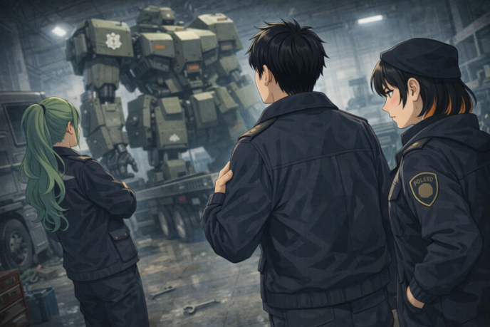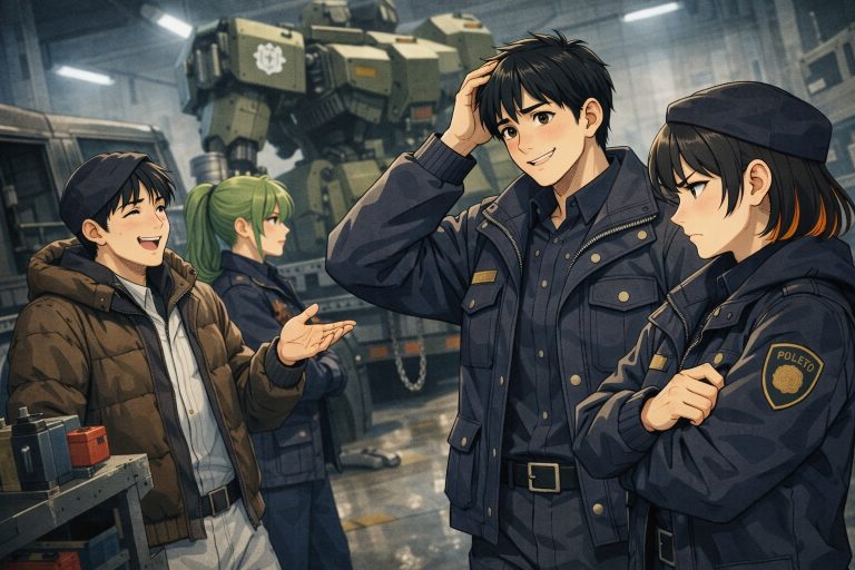たどり着いた機動部隊の詰め所に向かう途中のハンガーには油圧の匂いと金属音が響いていた。床に落ちたレンチが遠くでからんと鳴る。