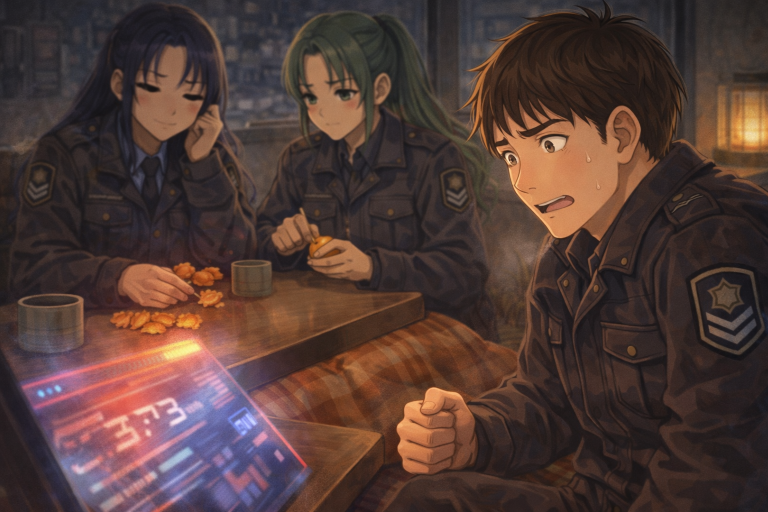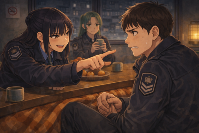 同意するアメリアの視線がカウラに向く。カウラの頬が朱に染まり、ゆっくりと視線が下に落ちた。二人の視線が触れては外れ、また戻る。コタツの天板の木目だけがやけに細かく見え、みかんの白い筋が指先にまとわりついた。