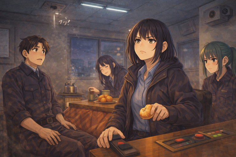 スピーカーがプツと鳴り、天井の蛍光灯が一拍だけちらついた。古い守衛室特有の乾いたホコリとストーブの灯油臭が、声に揺れる。