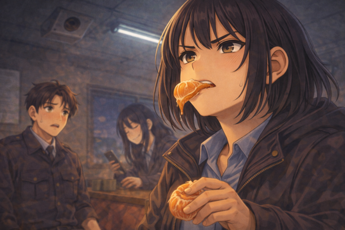 そう言うとかなめは半分のみかんを口に放り込んで噛み始めた。明らかにポーカーフェイスで報告書を受け取るランの顔を想像して怒りをこらえていた。そんなかなめの口の端からみかんの果汁が飛び散り、それの直撃を受けたカウラがかなめをにらみつけるがかなめはまるで気にしないというようにみかんを噛み締めた。かなめはみかんの皮を力任せにちぎって、白い筋を乱暴に払った。果汁が飛んで、カウラの頬に一滴……にらみ、それでも何も言わない。