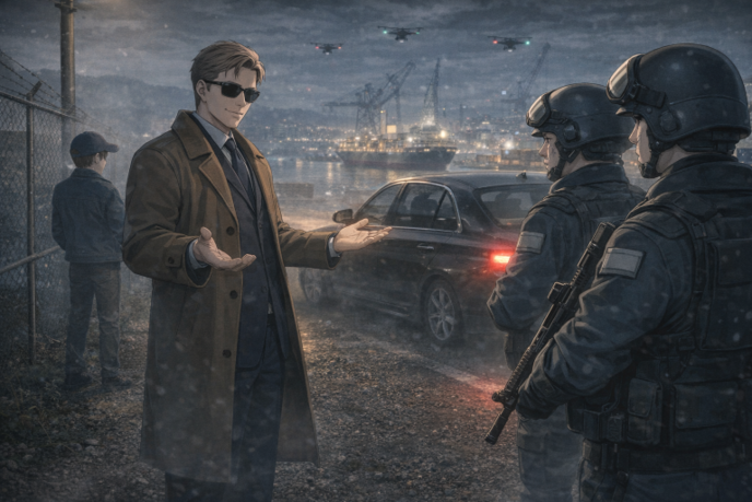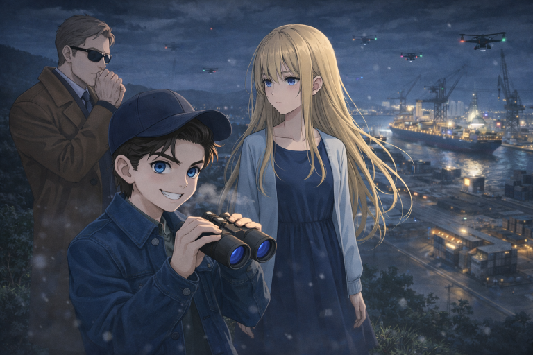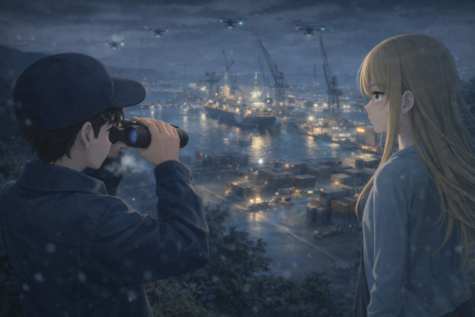 頭上を横切るドローンの赤と緑の微灯が、霧の縁を点で縫う。プロペラの乾いた唸りが、夜の港を薄く震わせた。