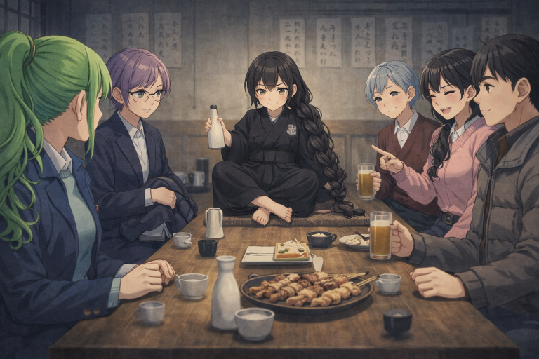 階段から、エルマが顔を出した。青いショートボブ。抱えたコートの裾が一度だけ風を孕み、眼鏡のレンズに階段灯が四角く走る。緊張が肩に残っているのが、見て取れた。階段からコートを抱えた青い髪のエルマが顔を出した。アメリアが隣の席に座れと指差すが、愛想笑いを浮かべたエルマはそのままかなめの隣のカウラと向かい合うテーブルの前に腰掛けた。