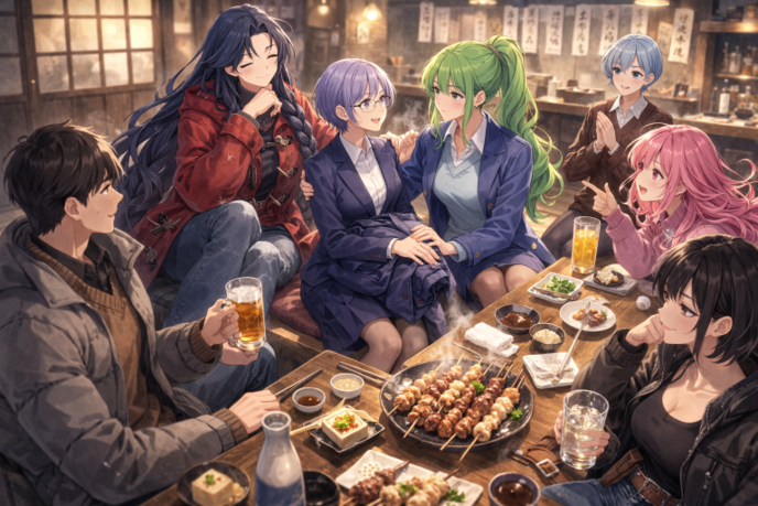 ランが立ち上がろうとしたタイミングで小夏が焼鳥盛り合わせを運んできた。焼きたての葱間から脂がじゅっと染み、胡椒とタレが鼻に届く。エルマが息を吐いた。眉間がほどけた。