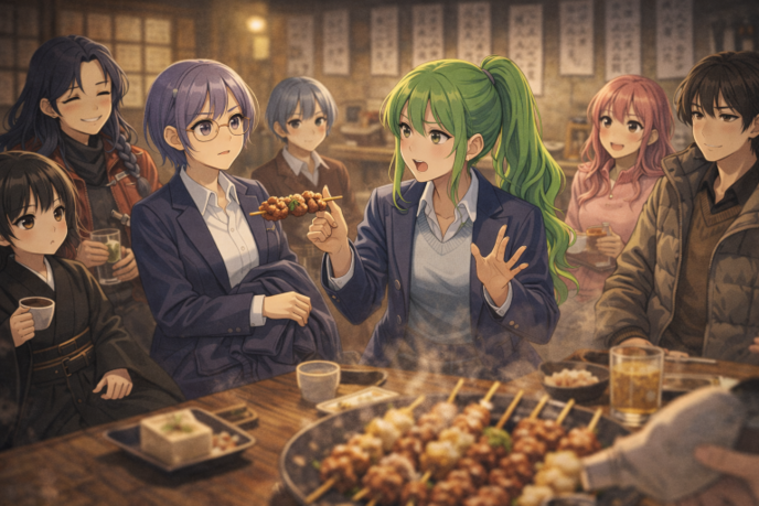 「ここのねぎまはネギが良いんだ。このネギとたれが実に絶妙で肉の油と口の中で混ぜながら食べると最高に幸せな気分になれる。エルマもやってみるといい。私もエルマも能谷のプラントで起動して埼王県自慢の旨い浅谷ネギの旨さに慣れたネギにはこだわりのある環境に育った人間なんだ」