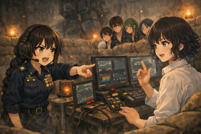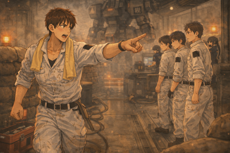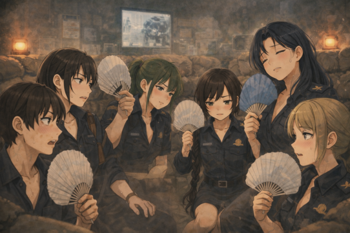 『武悪』の肝である『法術増幅触媒』の劣化による熱気がハンガーを蒸し上げている。誠達はそれぞれに手にうちわを持ってこれから行われる嵯峨をパイロットとした機動実験を見守っていた。警告灯の橙が土嚢の縁を舐め、汗の粒に小さな光点が跳ねる。