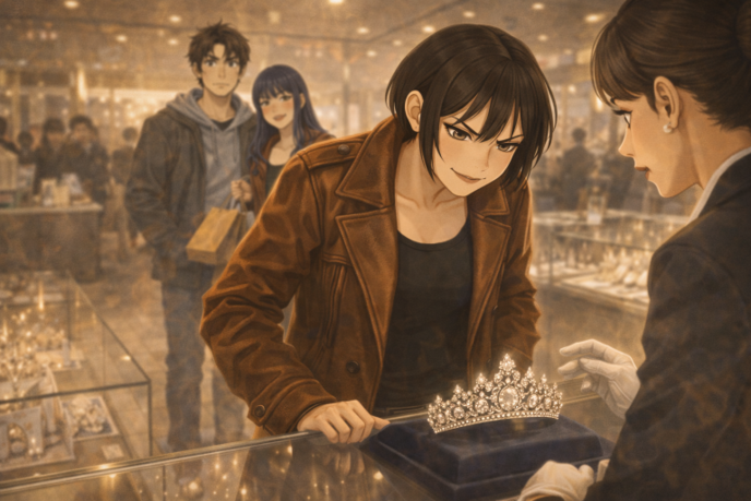 誠と同い年くらいの多少派手に見える化粧の店員が、参考出品のティアラを眺めているかなめに声をかけるが、まったくそのタレ目は冷酷に値踏みするような表情を浮かべるだけだった。ガラスの上に白手袋がガラスを滑り、ライトがカット面で粒の雨になる。