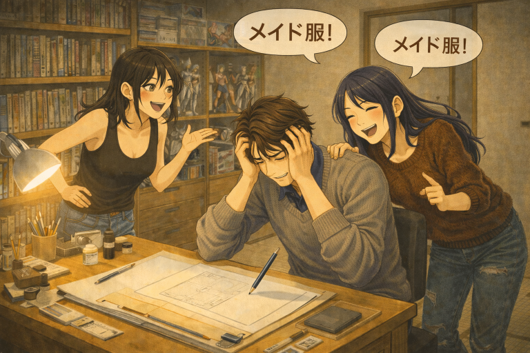 「それを着せてそれを参考にして描けばいいじゃねえか!それに神前はメイドさんが好きだろ?アメリアと一緒で。アタシは貴族の産まれだから知り合いの家に行くたびにメイドを見てきた。いろんなのがいたぞ……メイドについて知りたければアタシに聞け!」