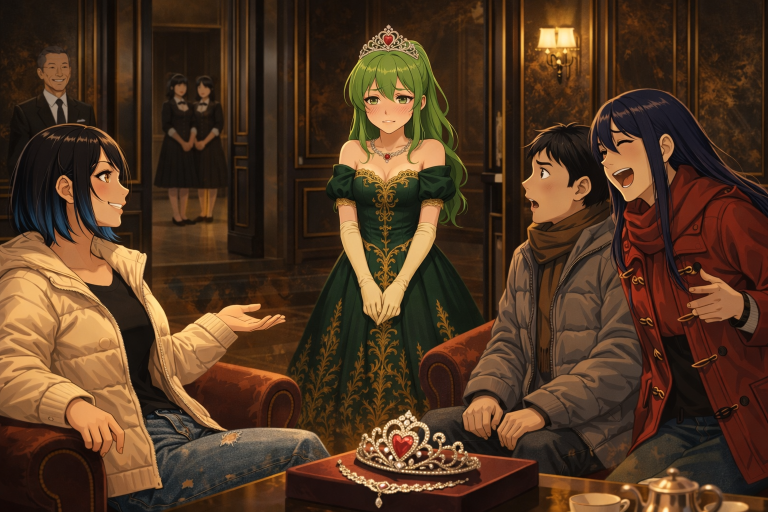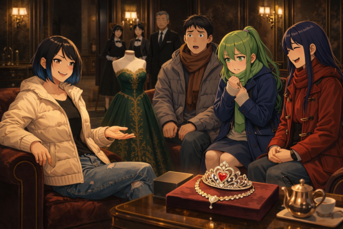 神田の言葉に先ほどカウラの為と指定したルビーのちりばめられたティアラとネックレス、そして緑の豪華な刺繍の施されたドレスを乗せた台車が部屋へと運ばれてきた。