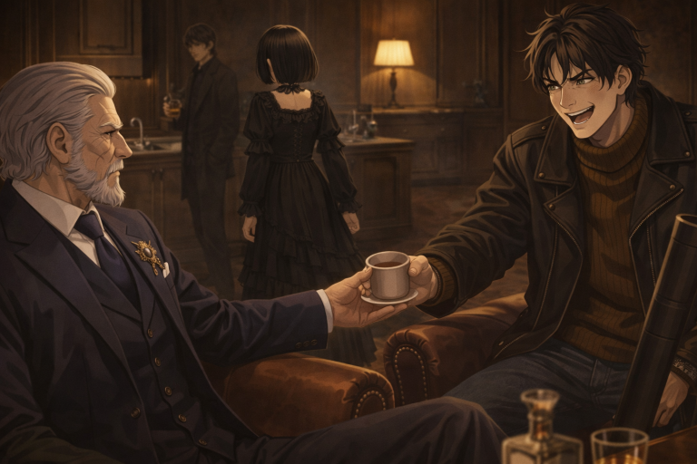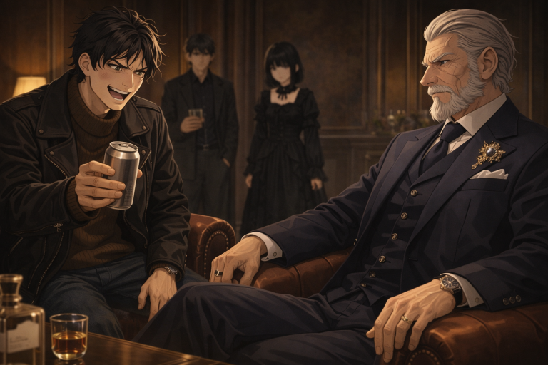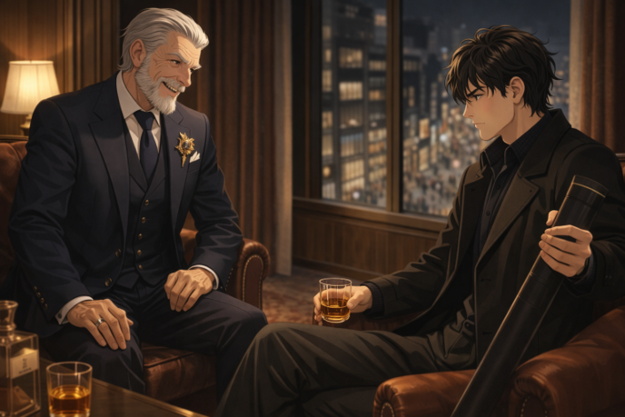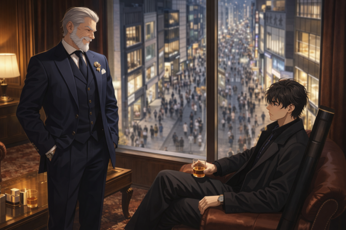 階下の繁華街を見下ろす老人を見ながらコートの男は静かに酒を飲み続けた。