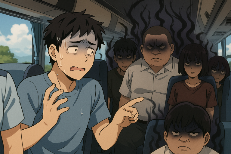 誠の寒気の原因は分かりきっているという調子でかなめはバスの後部座席に座る一団を指さした。