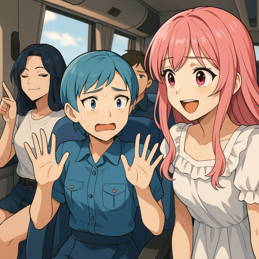 かなめの返しに、サラは「な、何よそれ!」とむくれる。バス内の空気は早くも騒がしく、だが不思議と心地よい。