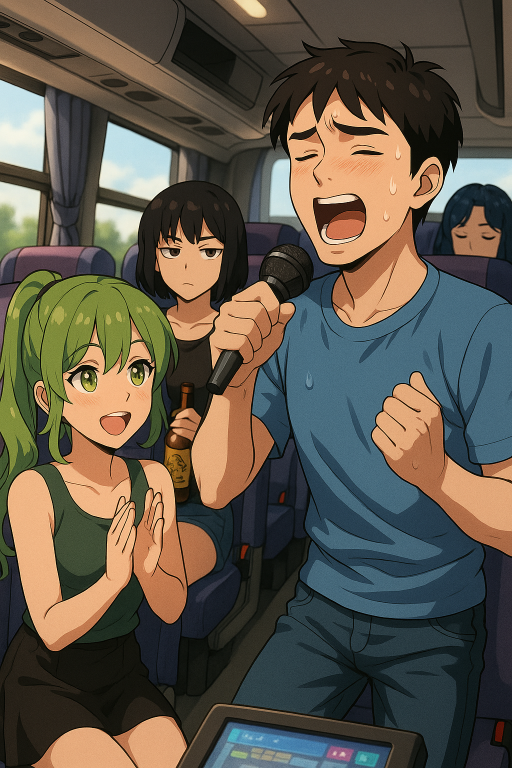 「歌うのは貴様だ。神前。バスの中でじっとしているから酔うんだ。歌でも歌って気分を変えればきっと酔わないに違いない」