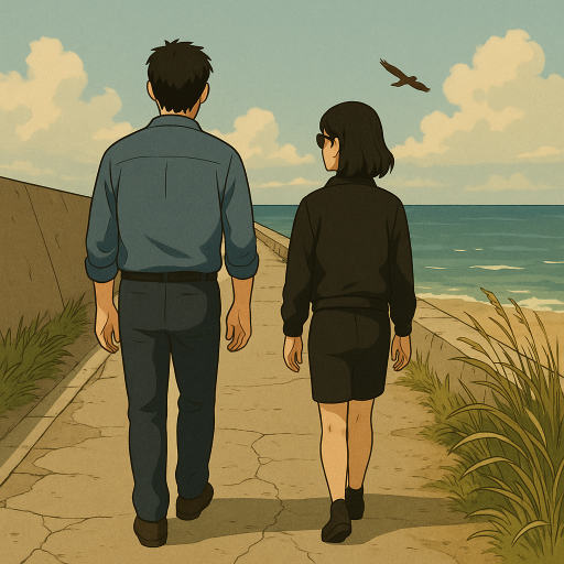 状況がわかってくると次第に機嫌の悪いいつものかなめに戻る。とりあえず誠についていてやることがサービスのすべてだとでも言うように、誠の視線に決してその視線は交わらない。誠も変に刺激しないようにと、ただ海岸線を二人して歩く。