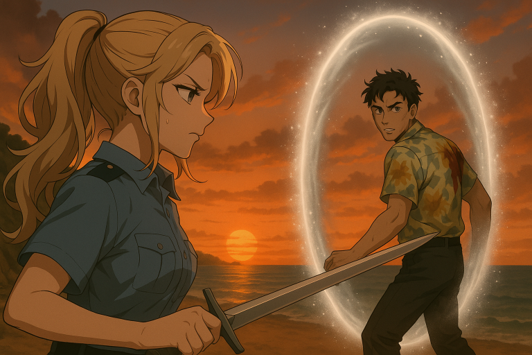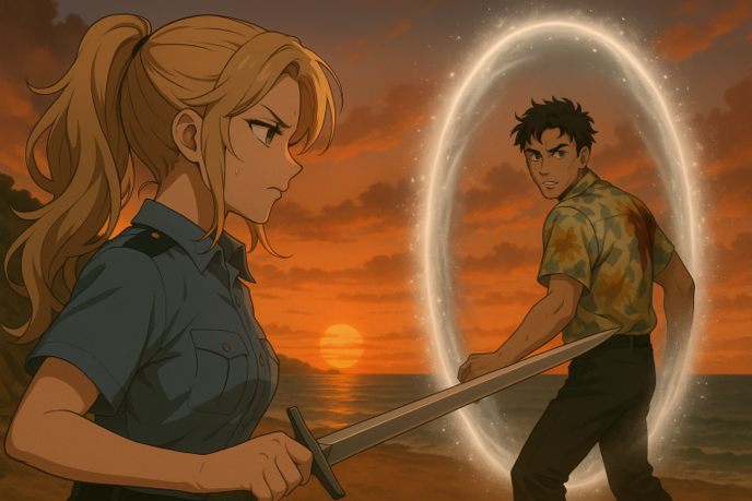 金色の干渉空間が、夕陽の中でまるで天上の門のように揺れた。