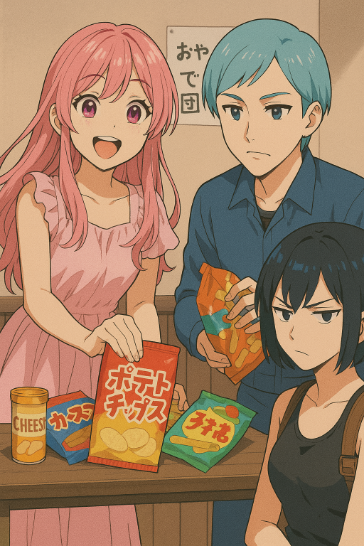 サラが机の上にポテトチップスの袋を置いた。さらに島田、パーラも手一杯の菓子やジュースをテーブルに広げる。