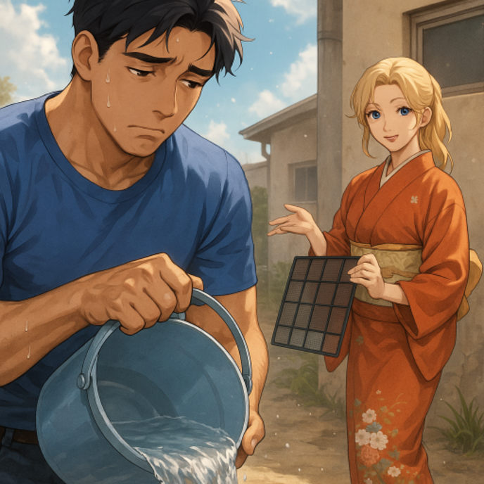水道の前でクーラーのフィルターを洗っているサラに声をかけられた誠は、汗を拭いながら洗い場に汚れた水を流す。