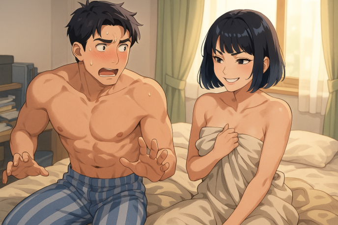 何かやわらかいものに触れた。誠は恐る恐るそれを見つめた。目線を下げた瞬間、肌色が視界を埋めた。心臓が跳ねる。信じたくない光景をもう一度見て確認する……そこには、眠たげな目をこする全裸のかなめがいた。誠は文字通り目が点になった。