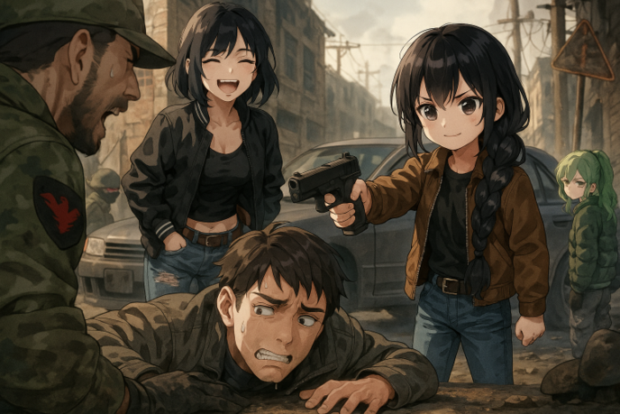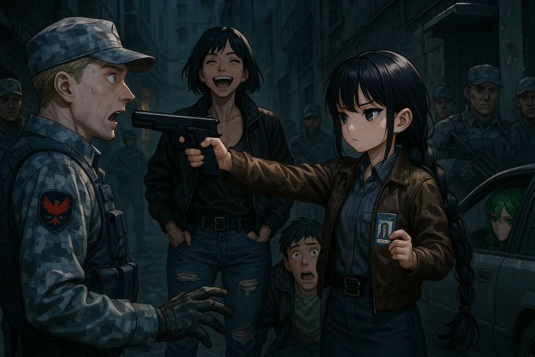 『租界』に慣れているというかなめに向けて誠はそう叫んだ。兵士の一人がドアの鍵が開いていることに気付くとそのまま誠を引きずりだして路上に這わせた。誠の肩を荒々しく掴んだ兵士の手は、砂と油でざらついていた。次の瞬間、冷たいアスファルトに押しつけられ、背中を打つ鈍い痛みが走る。耳元で安全装置を外す金属音がした瞬間、心臓が跳ね上がった。そしてすぐに兵士は誠の脇に拳銃があるのを見つけた。