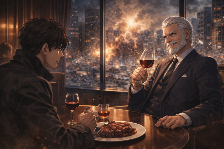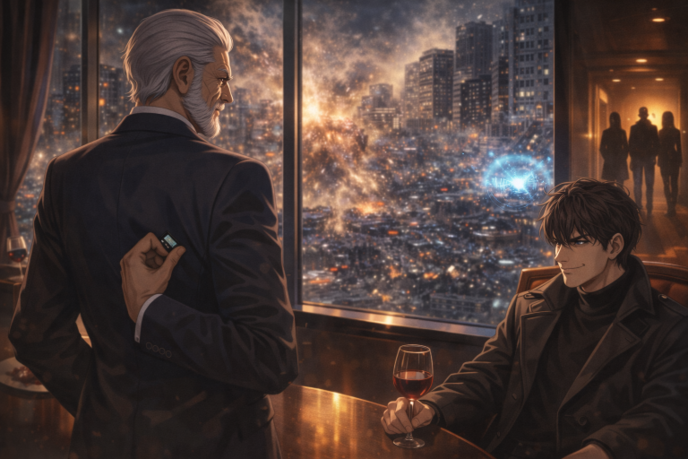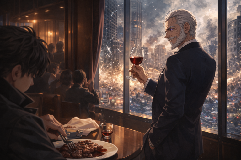 だが、そのすべてを見下ろせる位置にある東都第一ホテルの最上階レストランの大窓からその光景を眺める老人の目は、歓喜で輝いていた。まるで戦場の惨劇を観劇するかのように、口元に笑みを浮かべ、赤ワインを軽く揺らす。