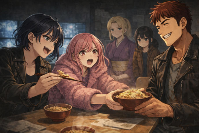 休憩室の空気が一変した。どんぶりを持つ手が止まり、誰もが息を呑む。