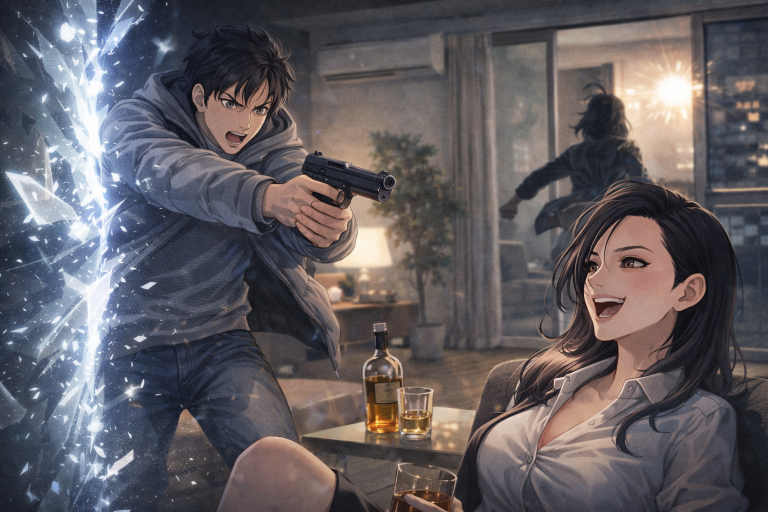 干渉空間から飛び出した視界に明るい照明のリビングが広がっていた。誠は拳銃を構えながら周囲の確認をした。そこにはウィスキーの酒瓶をテーブルに置いている四十手前位の女性がとろんとした瞳で誠を見つめていた。