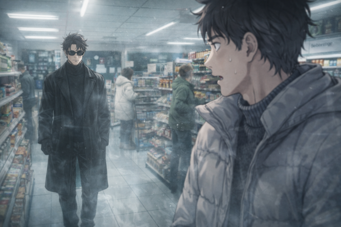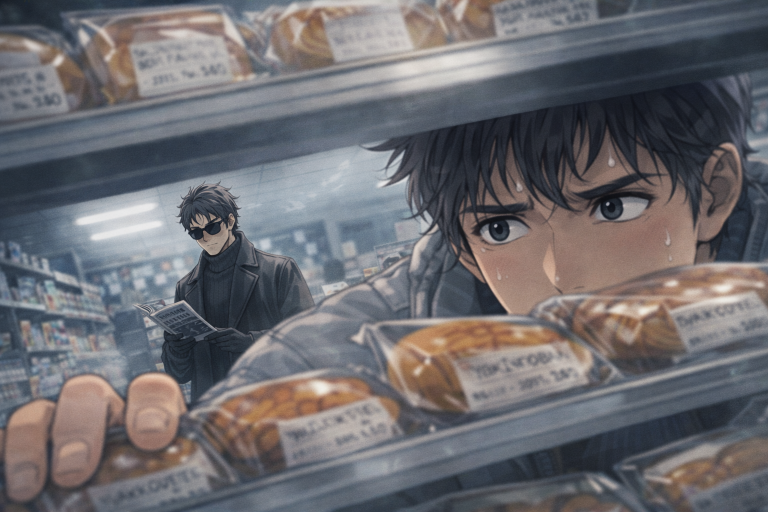 誠はそのまま入り口に向かい、買い物籠を手にしながら北川を監視していた。北川は漫画雑誌を手にとって読み続けていた。そのまま誠は調理パンの置かれた棚に移動しながらちらちらと北川の監視を続けた。