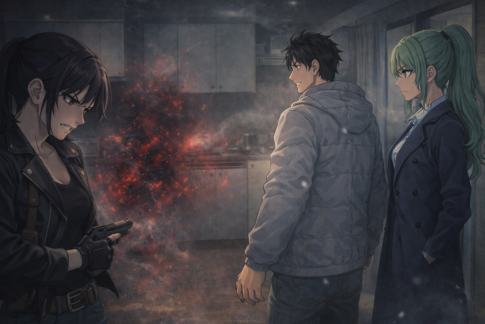 かなめがそれを知って突進すると、北川はその間にキッチンの後ろに姿を隠した。同時にドアが開き、銃を構えたカウラが誠とかなめに視線を送っていた。