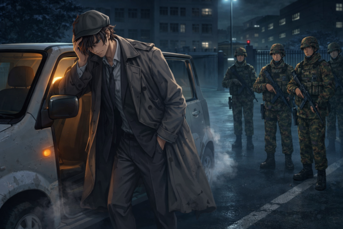 深夜の静まり返った空気の中、背の高い男が狭い車内から体を折り曲げるようにして現れる。嵯峨惟基。疲労で額を押さえ、汚れが目立つトレンチコートを脱ぎ捨てて下に着ていた皺の目立つスーツの裾を軽く払うが、埃は取れない。