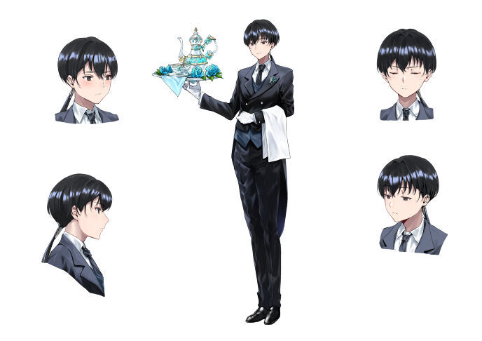 挿絵表情:左上→アリスを思い出している表情、右上→アリスのじゃじゃ馬加減に呆れてる表情、右下→アリスの専属になった夜に眠れず朝を迎えた表情