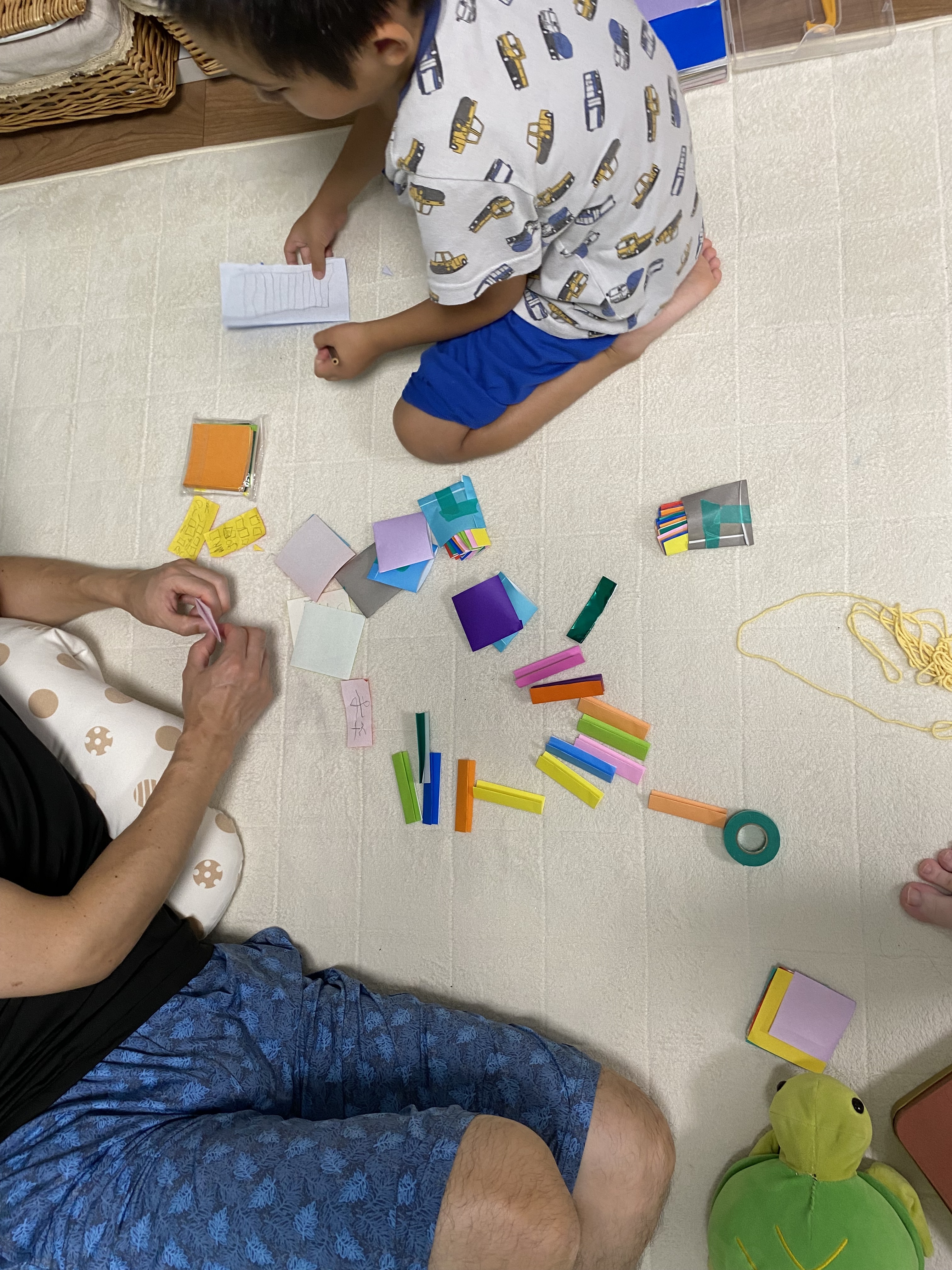 渋々折り紙を折らされている旦那。体育会系の旦那は細かい作業が苦手で明らかに嫌そう。