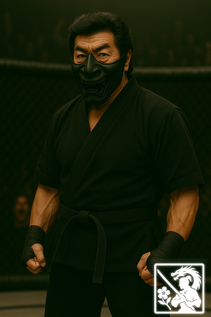 鈴が鳴り、リングが静まった。裁判が中央に立ち、覆面の手を高く挙げた。「TKO!」——観客席が静まり、場内アナウンスが響いた。「決勝戦、覆面格闘家の勝利!初参戦にして頂点に輝いた黒鉄の暴君、山岡修二!」