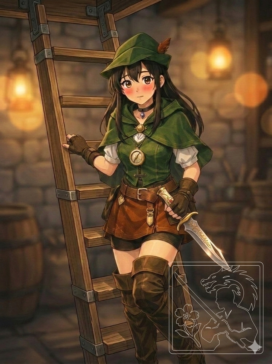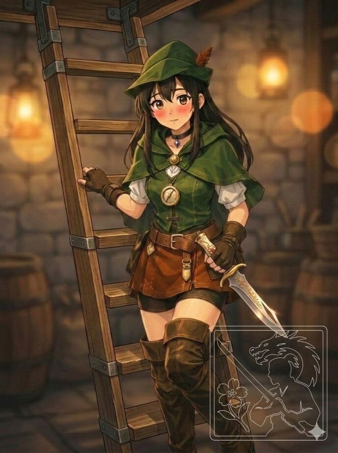 深緑のショートマントが肩を包み、控えめに光る留め具が胸元で彼女の小柄な体をまとめていた。下には赤褐色のスカートと黒いレザーのコルセットが重ねられ、戦うための機能性と女の子らしさを両立させている。肘上までを白い布が包み、手首までぴったりのグローブ。脚はロングブーツとレギンスで膝上までしっかり守られているはずなのに、その組み合わせが逆に、ニーハイのような妙な色気を生んでいた。ほんの少しだけ露出した、首筋と二の腕の白い肌。シルクのように滑らかな黒髪は丁寧に整えられ、肩から背中にかけて自然に流れている。