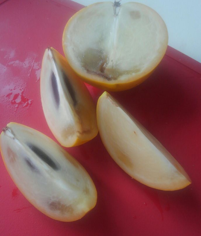 半分に割ると半透明の白い果実と大きな黒い種。スプーンで掬って食べて~と言われましたが、6等分してバクり。熟れきった柿と言うか水羊羹と言うか、というプルりん食感。