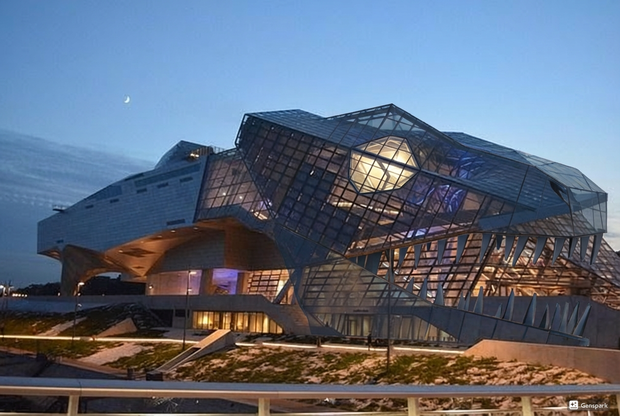 しおりを挟む『ここがLW記念ホールです』「なんか建物が恐竜の顔っぽいけど・・・?」『この建物の外観はT-REXをモチーフに作られています』「そうなんだ、なんか迫力があるね」ノアはスマートグラスのボタンを押して画面キャプチャした。歴史博物館LW記念ホールの外観の画像を保存して扉を開けて中に入ると広々としたエントランスがあって、誰でも中を自由に閲覧できるようになっていた。