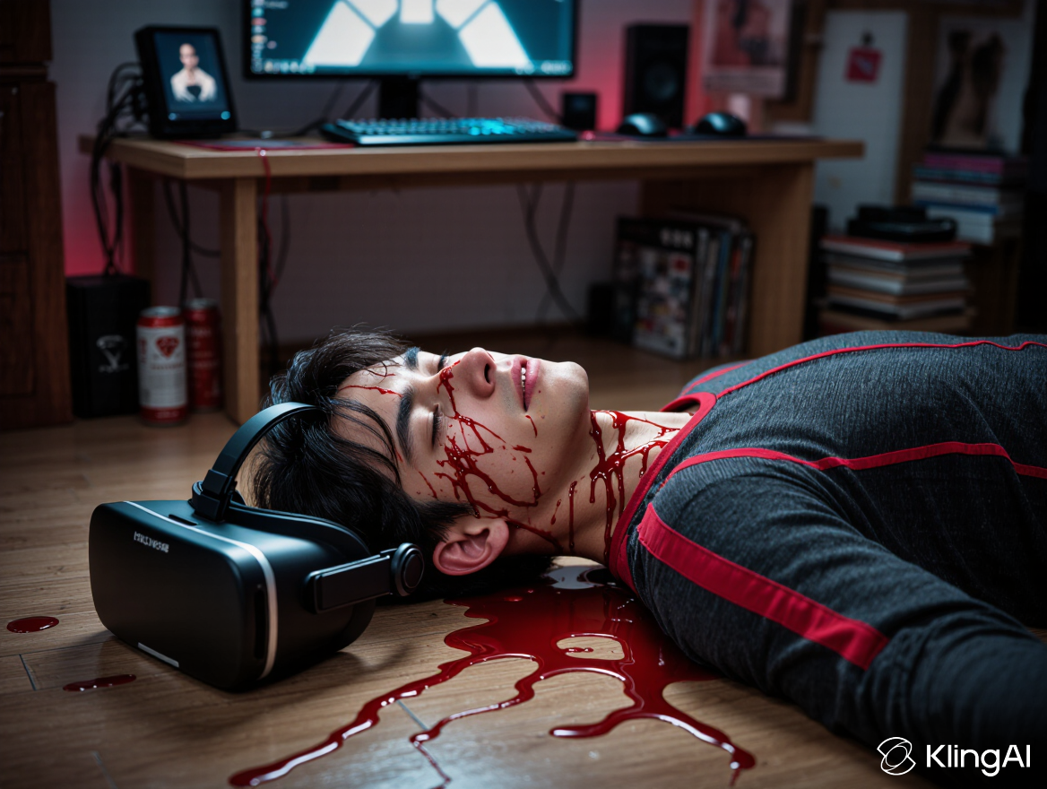 よく見ると頭部から血が垂れ流れているようだ。ポタポタと血が垂れているのを見て、刑事は不審に思い、VRゴーグルを手に取るとピコッピコッピコッっと秒針を刻む電子音がしている。(これはヤバイ!)