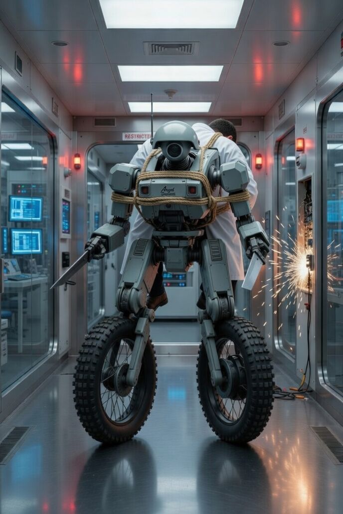 Small SERAPHがそっと後ろから近づき博士に声をかける「あんた、懲りてねぇな。まだそんなことやっていたのか?」声に驚いてラチエ博士は手元の瓶を落としそうになった。「おっと、なんだ?誰だ?アンドロイドのようだが私に何か用か?」玄関のドアを破壊したがその音は、ここには届いていなかったようだ。ラチエ博士は突然現れた来客に驚きと戸惑いを見せていた。
