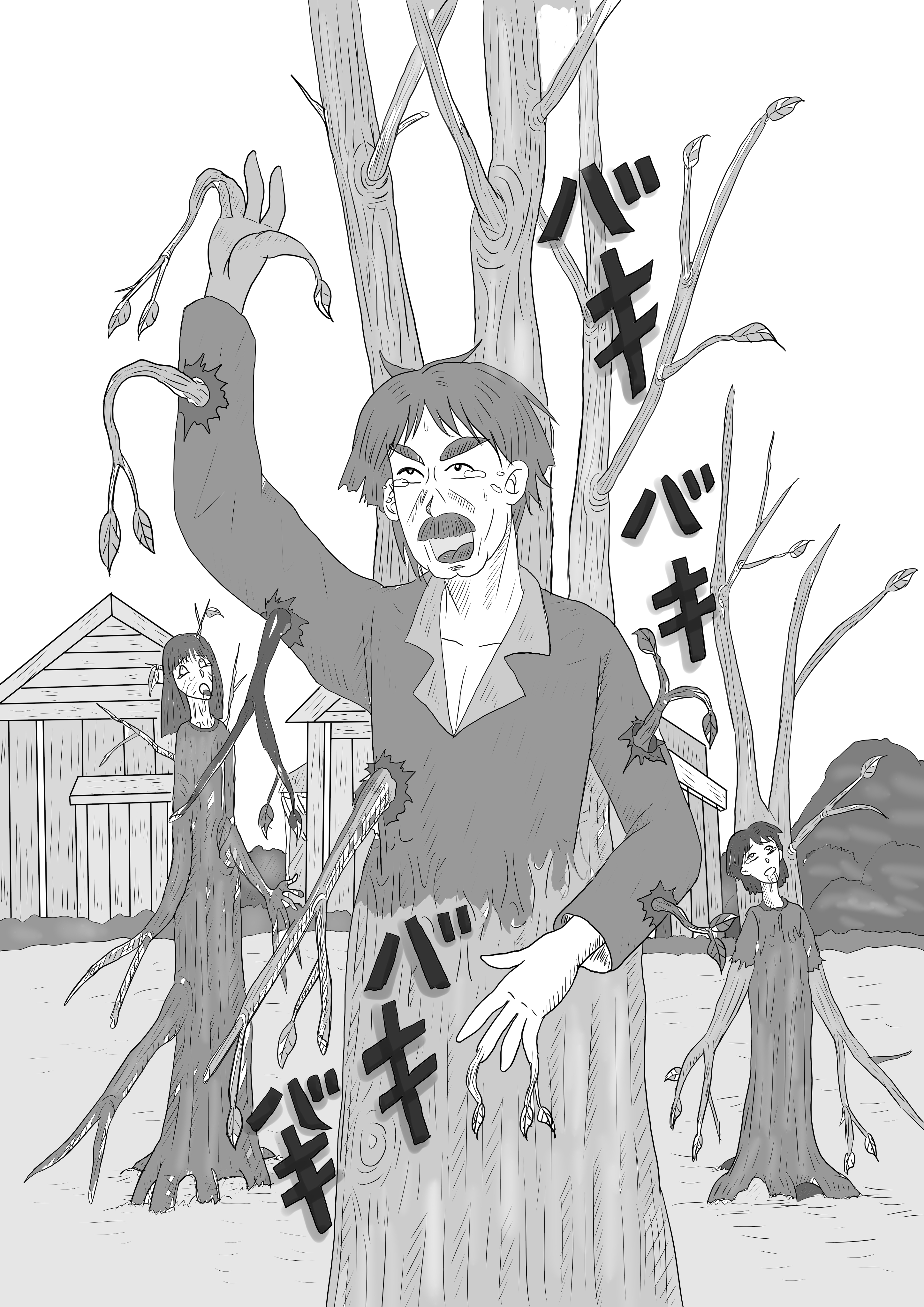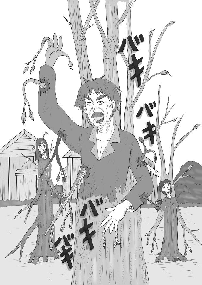「うわああぁぁぁぁぁ! 俺の体からも小枝が生えて来やがった。駄目だ、このままでは俺もあの村の人達のように一本の樹木に変えられてしまう!」