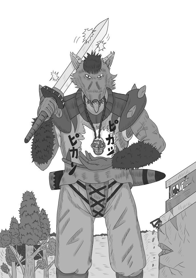 古代の遺物、賢者の魔石を見せ付けながら、目の前に立ちはだかる狼魔族のボス、ザドの図です。